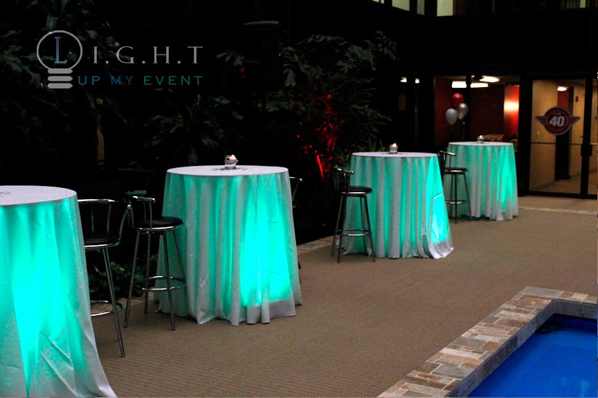 There are so many places you can use this approach. The most noticeable place to have lighting is under the head table. This is the focal point of a room and a majority of photos will be taken with this as a backdrop. Besides the head table, you can even light up cocktail tables and guest tables. If you are looking to light up your tables, we suggest you use a light weight white linen. It will be easier to saturate with color and be visible to your guests. People are curious and they will wonder how you managed to pull off this look. It will turn out to be a conversation piece at your event.